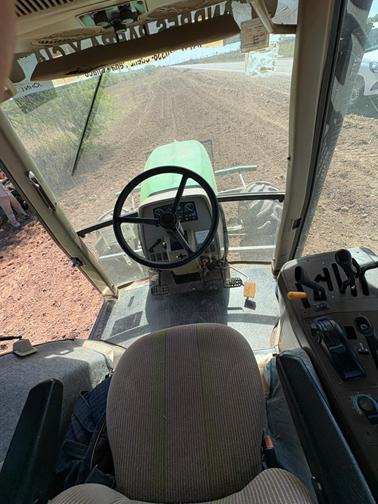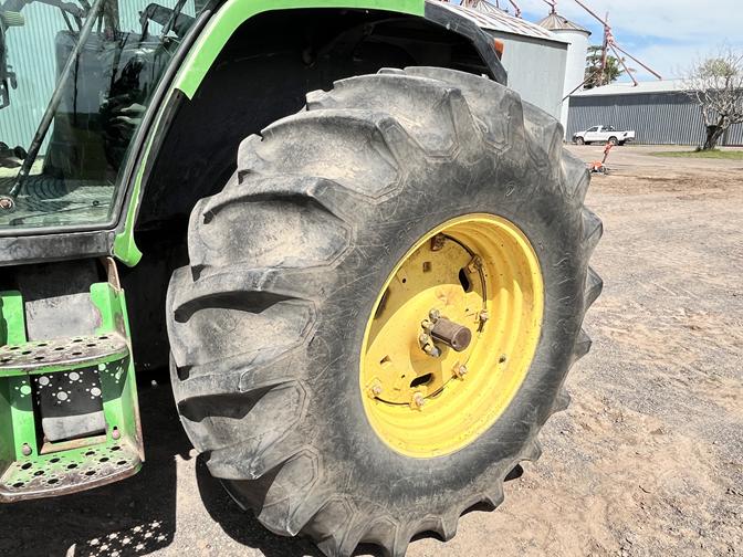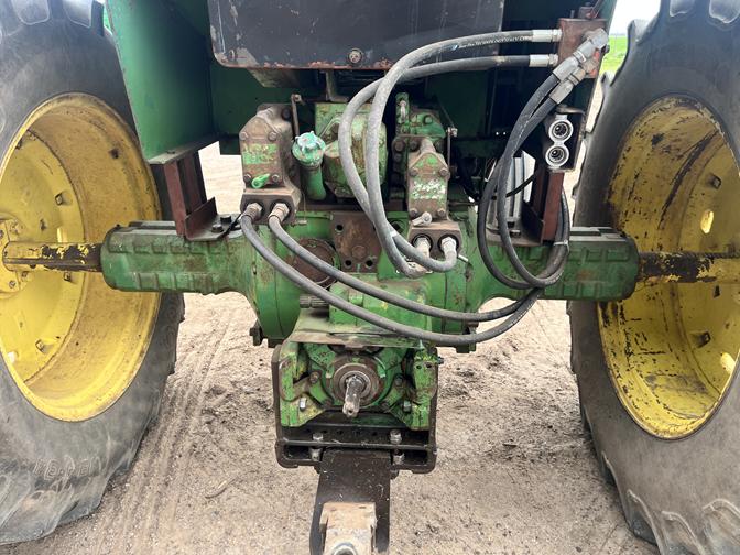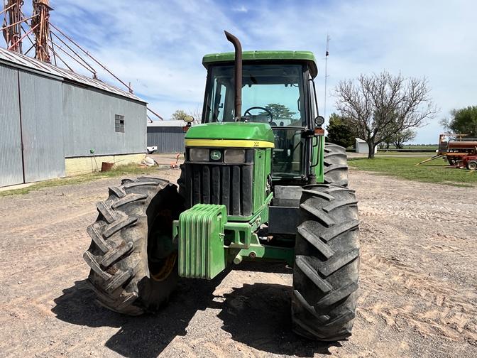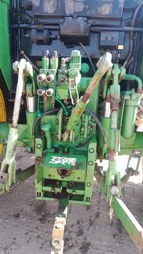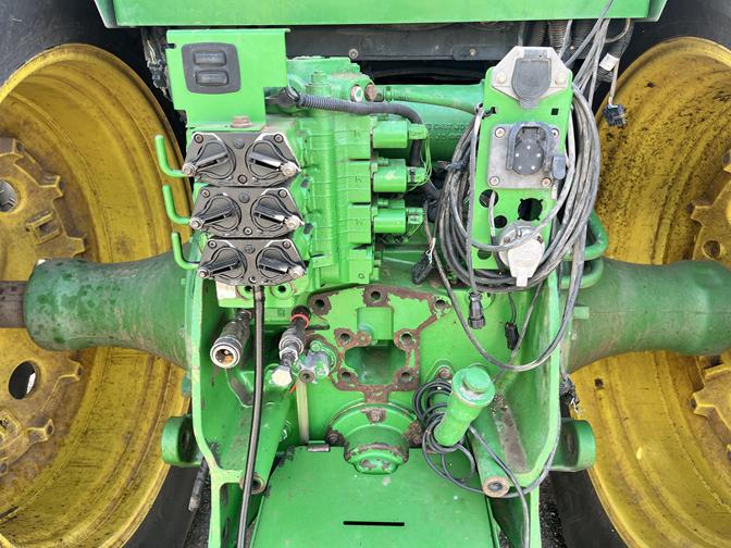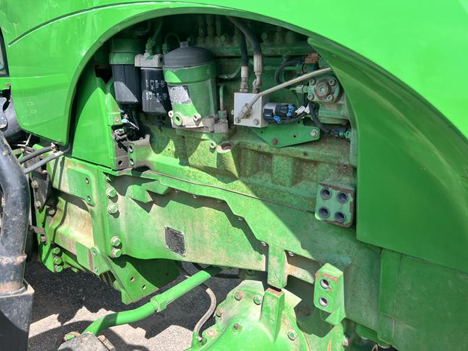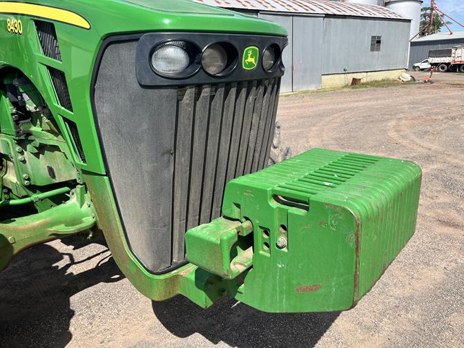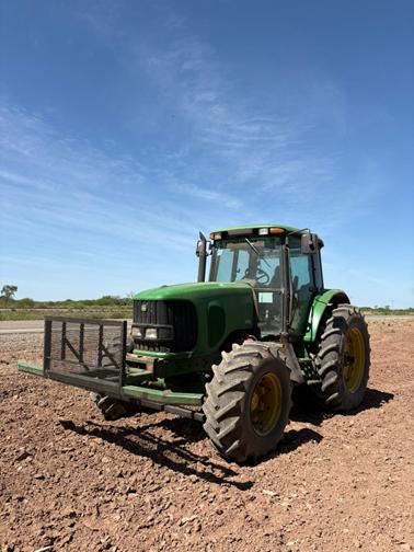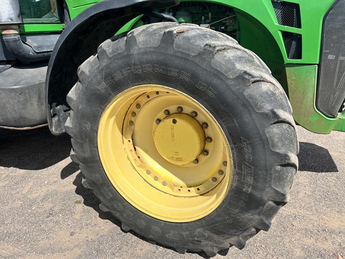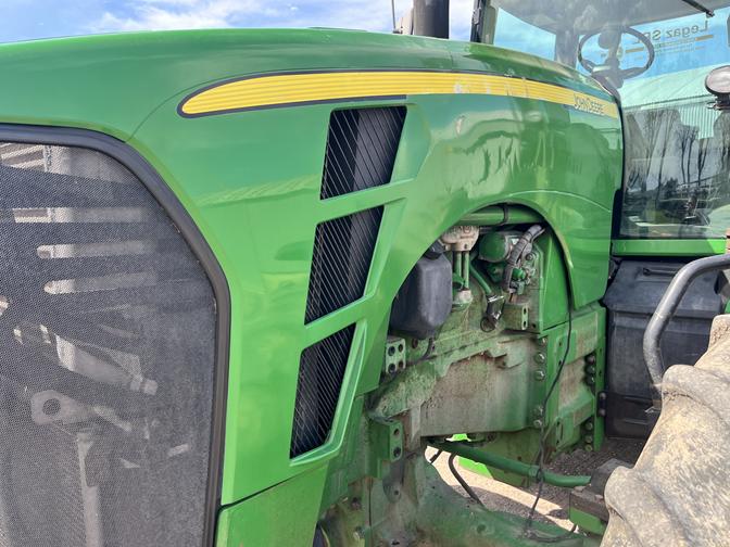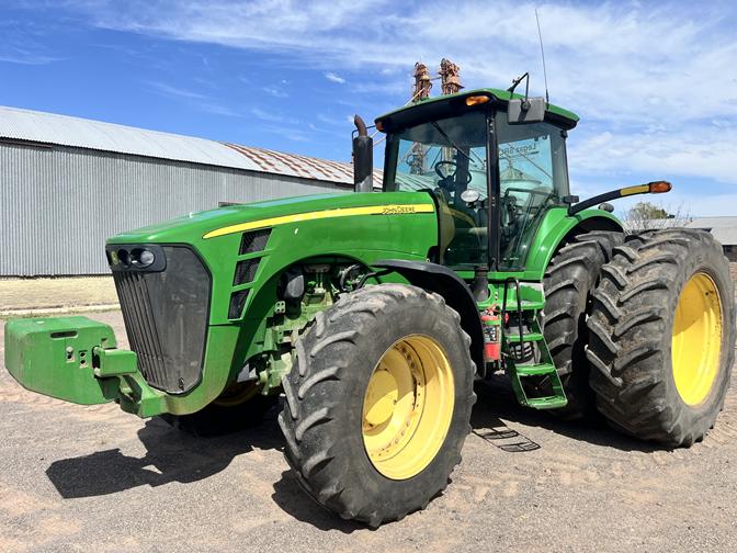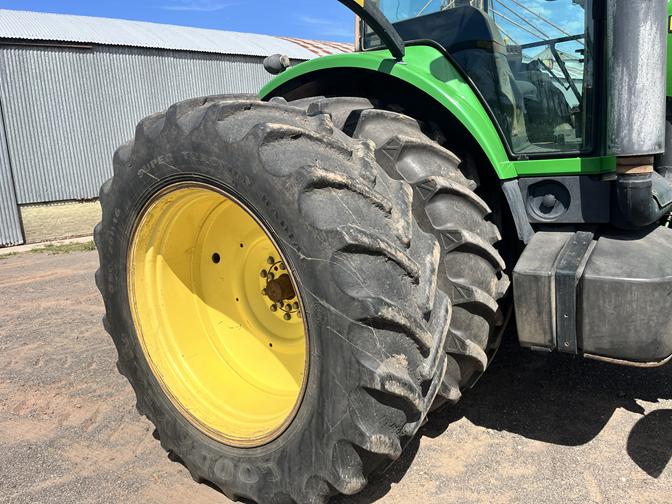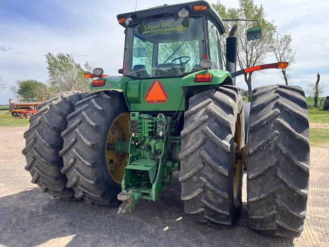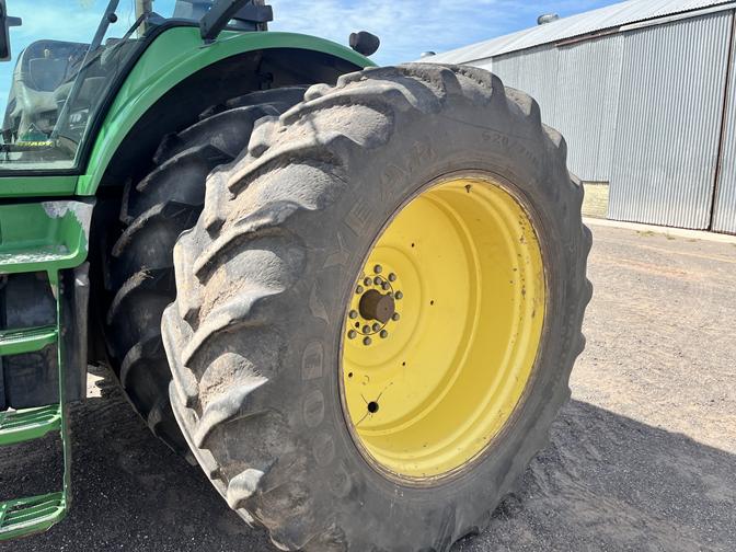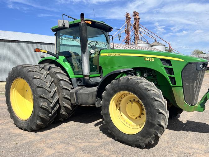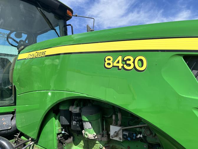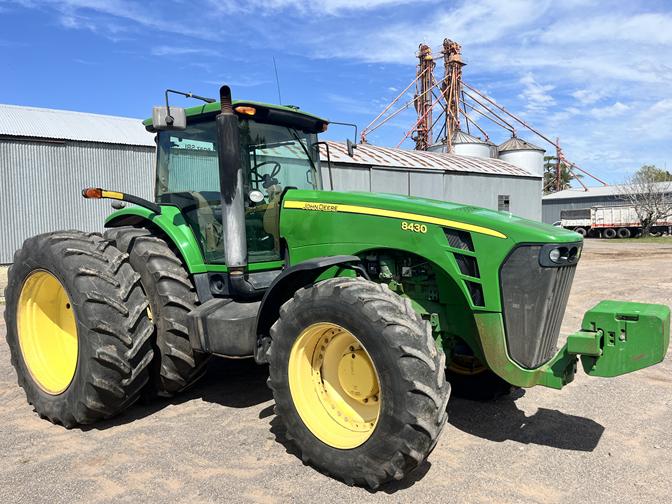 Tractor John Deere 8430 DT, año 2008, motor de 305 HP con 16.500 hs., piloto con antena Starfire 6000, a. acond y calef. en funcionamiento, cubiertas tras. duales 620/70 R46 en 50% y del. 420/85 R34 en 20%, 3 sal. hid. toma fuerza.-