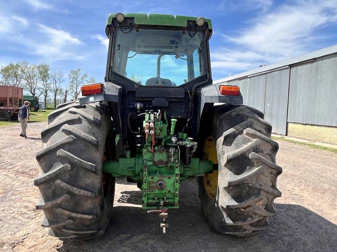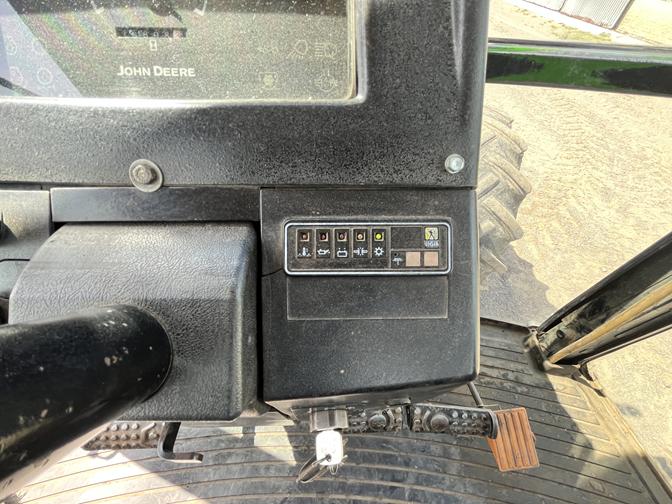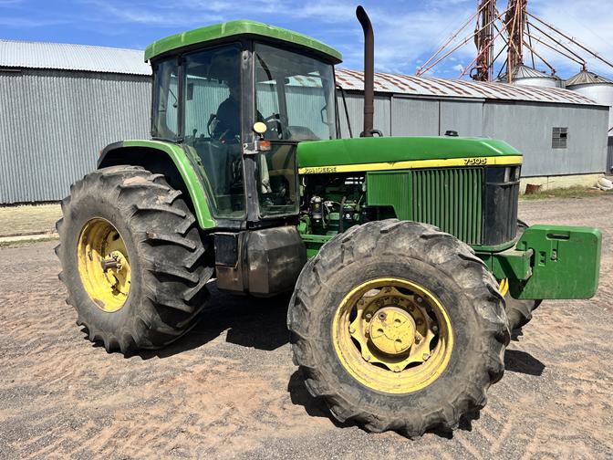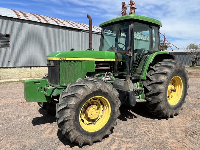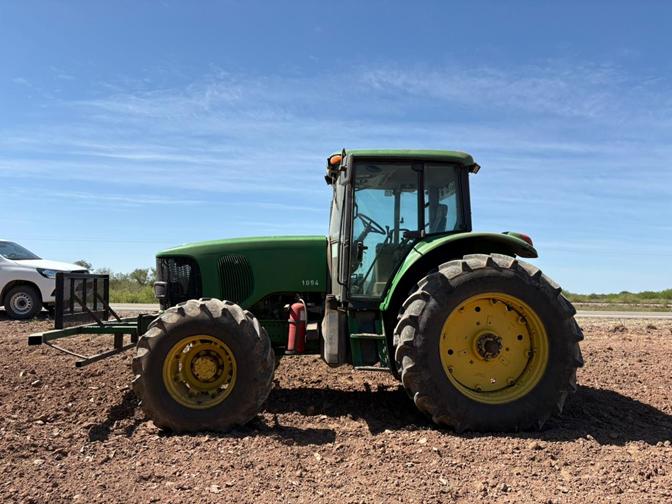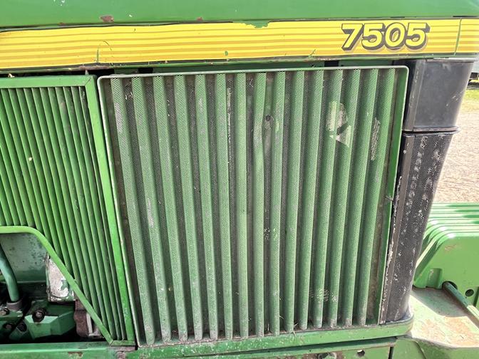 Tractor John Deere 7505 DT, motor de 140 HP con 16.000 hs, vigía, a. acond., cubiertas tras. 24.5-32 en 60% y del. 18.4-26 en 40%, 2 sal. hid., toma fuerza.-